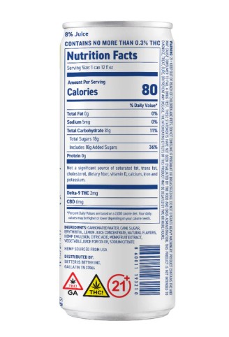 Carbonated Water, Erythritol, Lemon Juice Concentrate, Citric Acid, Hemp Emulsion, Natural Flavors, Monkfruit Extract, Stevia Extract (Rebaudioside A), Vegetable Juice for Color Sodium Citrate