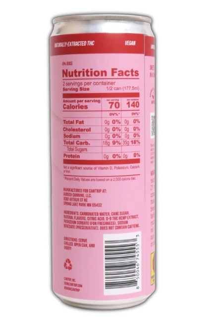 Carbonated Water, Cane Sugar, Natural Flavors, Citric Acid, Delta-9 THC Derived from Hemp, Potassium Sorbate (For freshness), Sodium Benzoate (Preservative). Does not contain caffeine.
