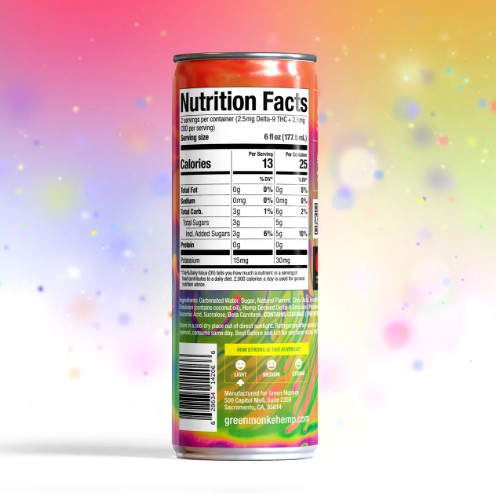 Ingredients: Carbonated Water, Sugar, Natural Flavors, Citric Acid, Hemp Derived CBD Emulsion, Hemp Derived Delta-9 Emulsion, Potassium Sorbate, Ascorbic Acid, Sucralose, Beta Carotene.