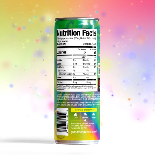 Ingredients: Carbonated Water, Sugar, Natural Flavors, Citric Acid, Hemp Derived CBD Emulsion, Hemp Derived Delta-9 Emulsion, Potassium Sorbate, Ascorbic Acid, Sucralose, Blue 1