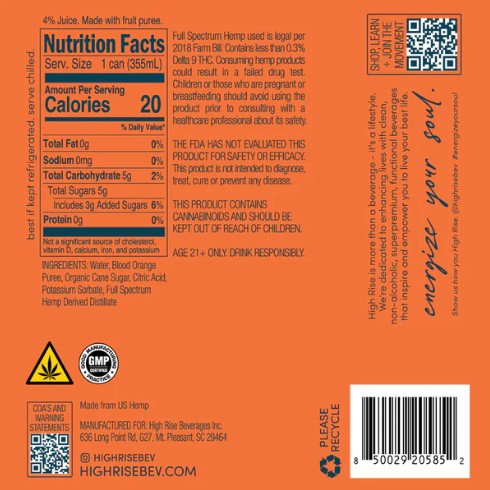 Water, Blood Orange Puree, Organic Cane Sugar, Citric Acid, Potassium Sorbate, Full Spectrum Hemp-Derived Distillate