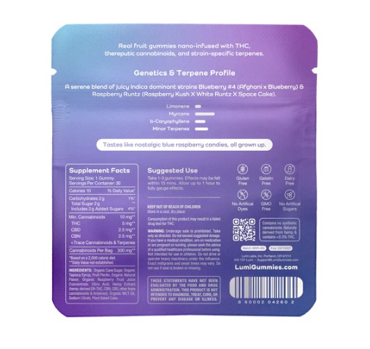 This 30-count bag of our Bluerazz Runtz contains 5mg of Delta-9 THC and 5mg of Terpenes and Minor Cannabinoids per Indica gummy.