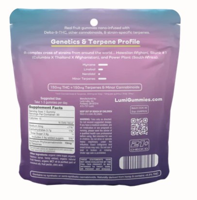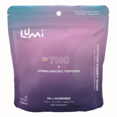 This 30-count bag of our Cotton Candy Kush contains 5mg of Delta-9 THC and 5mg of Terpenes and Minor Cannabinoids per indica gummy.
