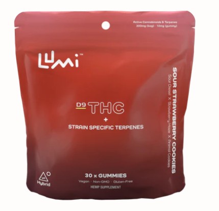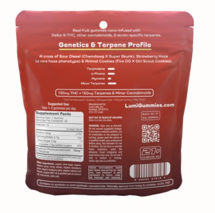 This 30-count bag of our Sour Strawberry Cookies contains 5mg of Delta-9 THC and 5mg of Terpenes and Minor Cannabinoids per hybrid gummy.