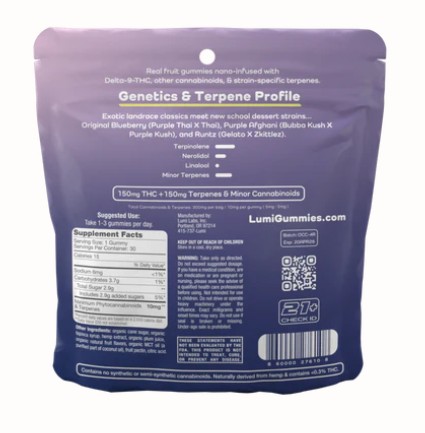 This 30-count bag of our Plum Berry Runtz contains 5mg of Delta-9 THC and 5mg of Terpenes and Minor Cannabinoids per indica gummy.