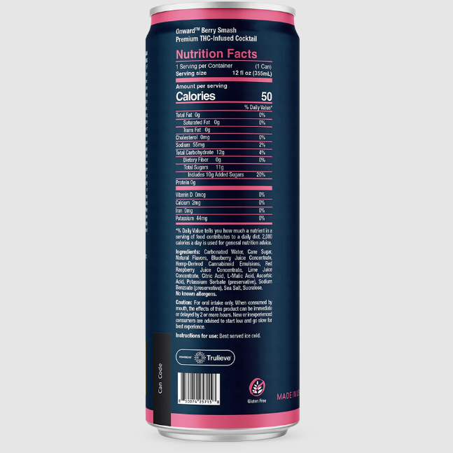Each serving contains 40-60 calories, as well as 3 mg, 5 mg or 10 mg of THC. Onward is made with natural fruit juice (less than 10%), and contains no alcohol or high-fructose corn syrup.