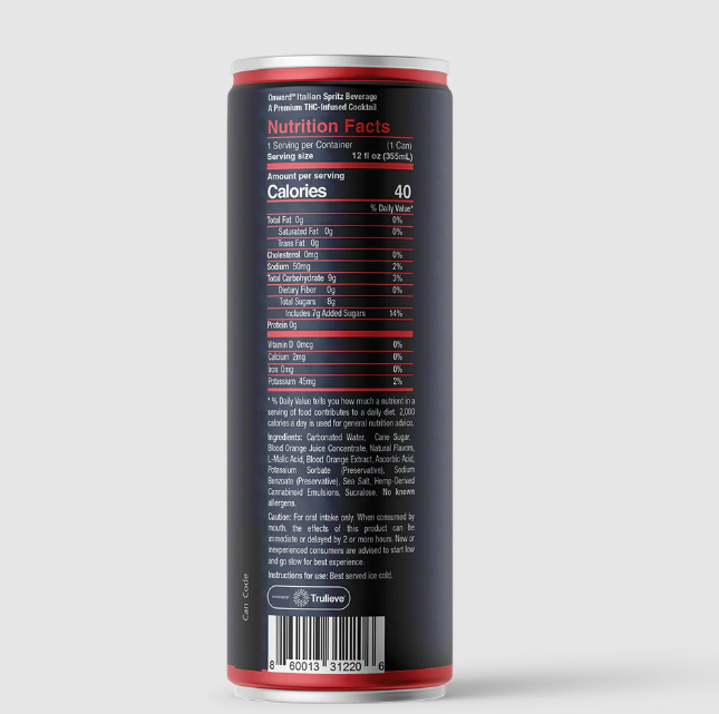 Carbonated water, Cane Sugar, Blood Orange Juice Concentrate, Natural Flavors, L-Malic Acid, Blood Orange Extract, Ascorbic Acid, Potassium Sorbate (preservative), Sodium Benzoate (preservative), Sea Salt, Hemp Derived Cannabinoid Emulsions, Sucralose.
