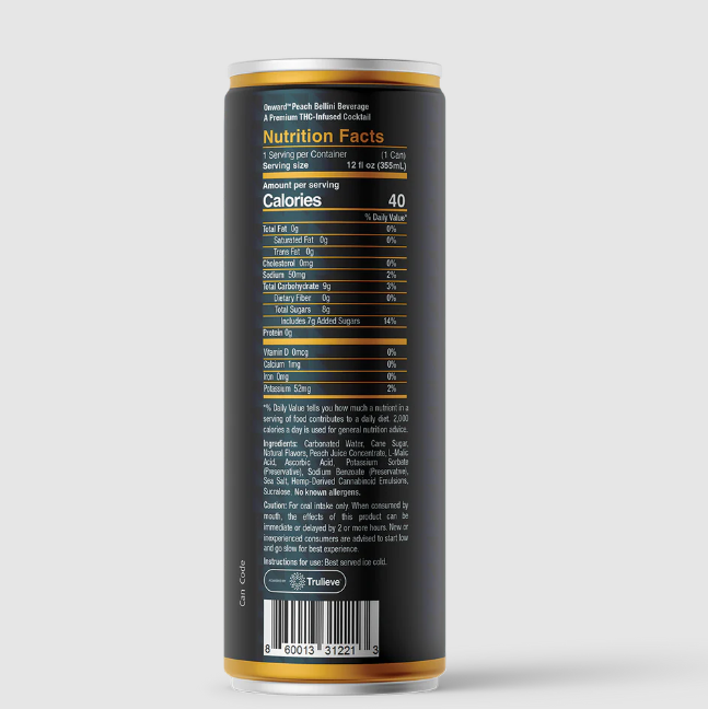 Carbonated water, Cane Sugar, Natural Flavors, Peach Juice Concentrate, L-Malic Acid, Ascorbic Acid, Potassium Sorbate (preservative), Sodium Benzoate (preservative), Sea Salt, Hemp Derived Cannabinoid Emulsions, Sucralose