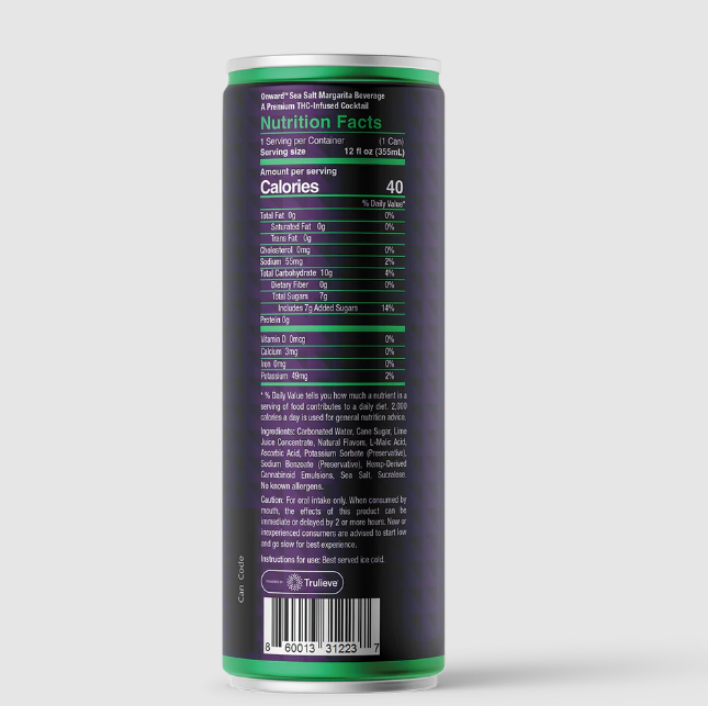 Each serving contains 40-60 calories, as well as 3 mg, 5 mg or 10 mg of THC. Onward is made with natural fruit juice (less than 10%), and contains no alcohol or high-fructose corn syrup.