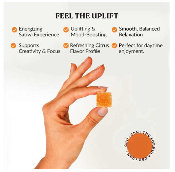 Ingredients: Organic Cane Sugar, Organic Tapioca Syrup, Pectin, Natural Orange Flavor, Citric Acid, Hemp-Derived Delta-9 THC, Myrcene, Terpinolene, α-Pinene, Natural Coloring
