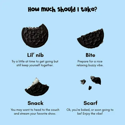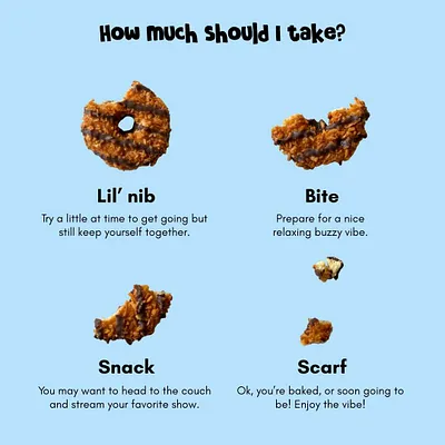 Start with one serving (1/4 of the cookie = 7.5mg D9) and wait up to 2 hours before taking more. These are potent — do not operate vehicles or heavy machinery after use, and always keep away from children.