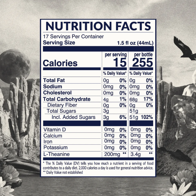 The Low-dose bottle contains: 5mg THC per shot (85 mg total), 2mg CBD (34 mg total), 2mg CBG (34 mg total), and 200mg L-Theanine (3400 mg total), 10 calories & 2 g sugar per serving