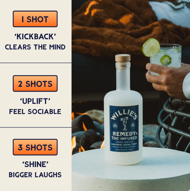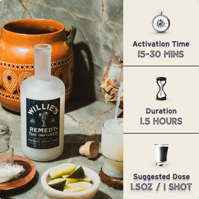 Yes! Fast-acting (~15 minutes) and short-lasting (~1–1.5 hours), Willie’s Remedy+ is not that feared edible you ate too much of in college. Whether you’re looking for a euphoric social tonic, a relaxing moment at home, or a calming daily plant-powered ritual, Willie’s Remedy+ offers a safe and customizable way to enjoy cannabis. Perfect for first-timers, canna-curious adventurers, or seasoned cannabis enthusiasts, our drinks let you craft your journey one sip at a time.