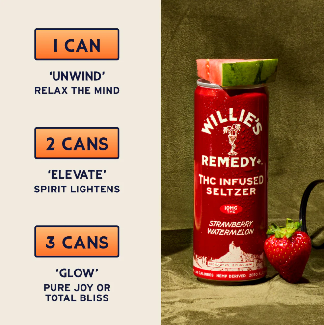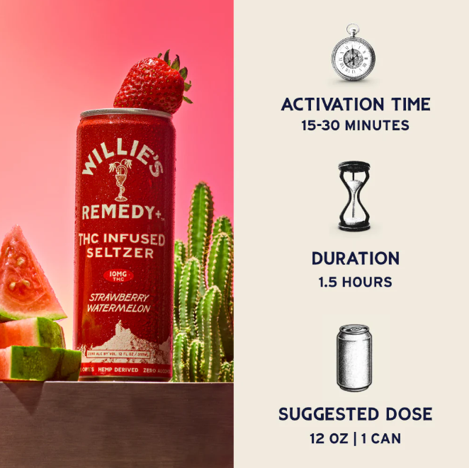 Yes! Fast-acting (~15 minutes) and short-lasting (~1–1.5 hours), Willie’s Remedy+ is not that feared edible you ate too much of in college. Whether you’re looking for a euphoric social tonic, a relaxing moment at home, or a calming daily plant-powered ritual, Willie’s Remedy+ offers a safe and customizable way to enjoy cannabis. Perfect for first-timers, canna-curious adventurers, or seasoned cannabis enthusiasts, our drinks let you craft your journey one sip at a time.
